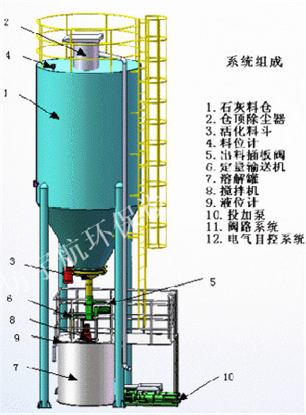 石灰料倉、倉頂除塵器、活化料斗、料位計(jì)、出料插板閥、螺旋輸送機(jī)、溶解罐、攪拌機(jī)、磁翻板液位計(jì)、螺桿泵、管路系統(tǒng)、電器自控系統(tǒng)。